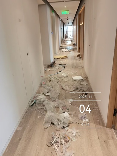 此公寓在此之前未做开荒保洁,项目启动初期,现场存在大量建筑垃圾残留、玻璃胶痕顽固、地面水泥点密集等典型开荒难题。若按常规流程,150套公寓的开荒精保至少需8-10个工作日。我司接到开荒加精保一起四天时间必须按时交付的任务,时间紧迫,我们承诺标准不降,准时交付,挑战虽大,品质为先,团队用实力证明我们从不掉链子。