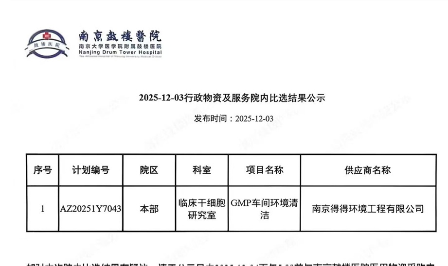 我司成功中标南京鼓楼医院干细胞研究所GMP车间环境深度清洁消毒项目!